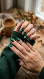Emerald green velvet nails reflect light beautifully and look like tiny gemstones on your fingertips. This shade feels rich and sophisticated for fall fashion.